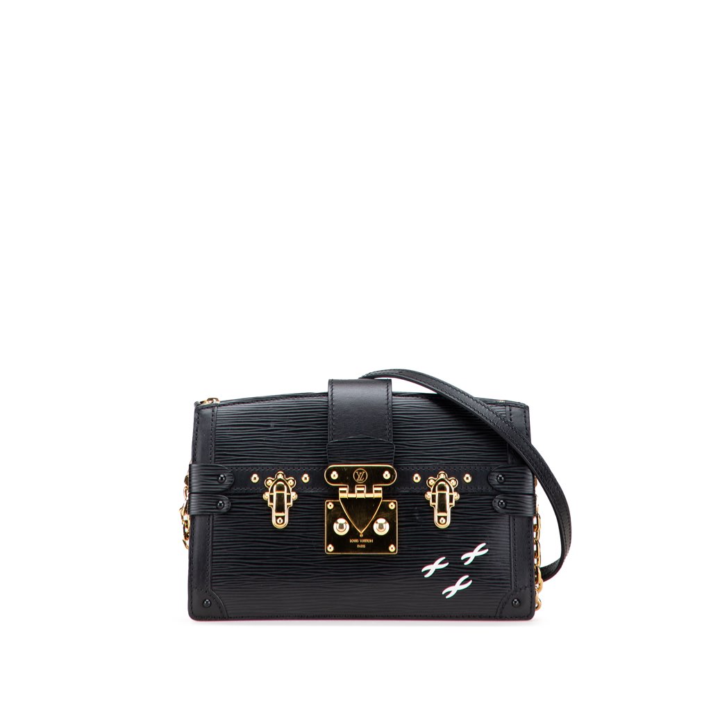 The Trunk clutch features an epi leather body, a chain link and an adjustable leather strap, a top strap with an S-lock closure, a top zip closure, and an interior slip pocket.