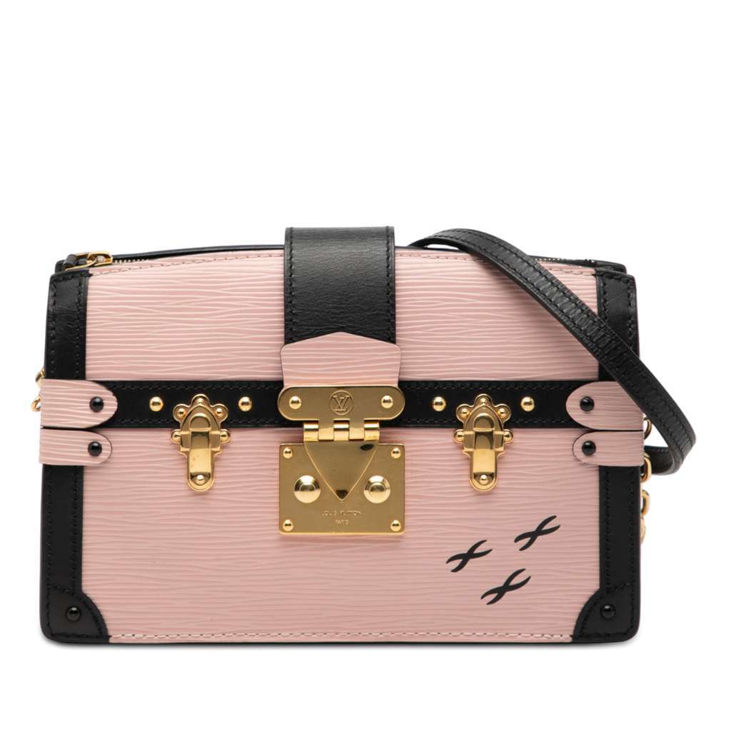 The Trunk clutch features an epi leather body, an adjustable and detachable chain link strap with leather guard, a top strap with S-lock closure, a top zip closure, and an interior slip pocket.