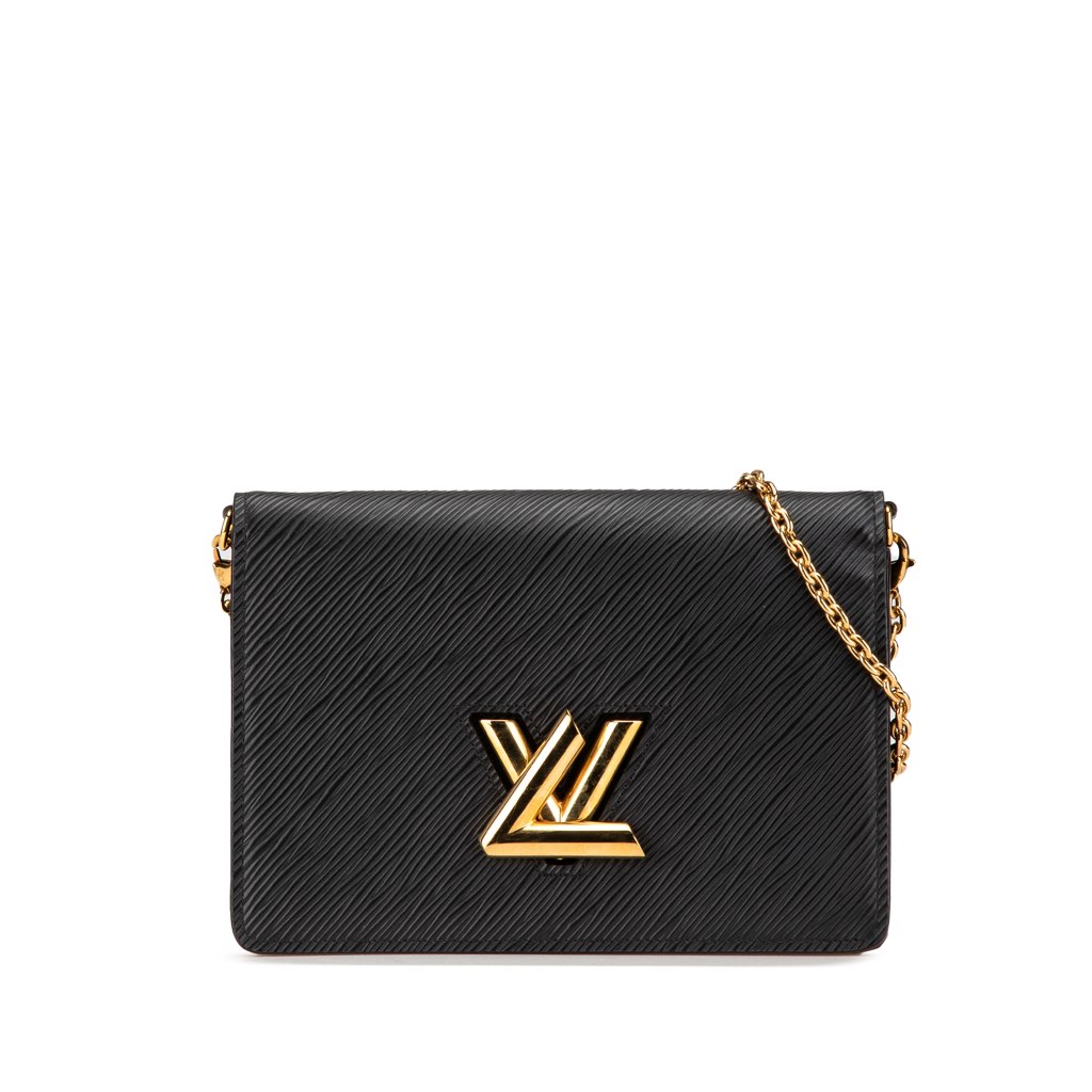 This chain wallet features an epi leather body, a removable chain link shoulder strap, a front flap with an LV twist lock closure, and interior slip and zip pockets.