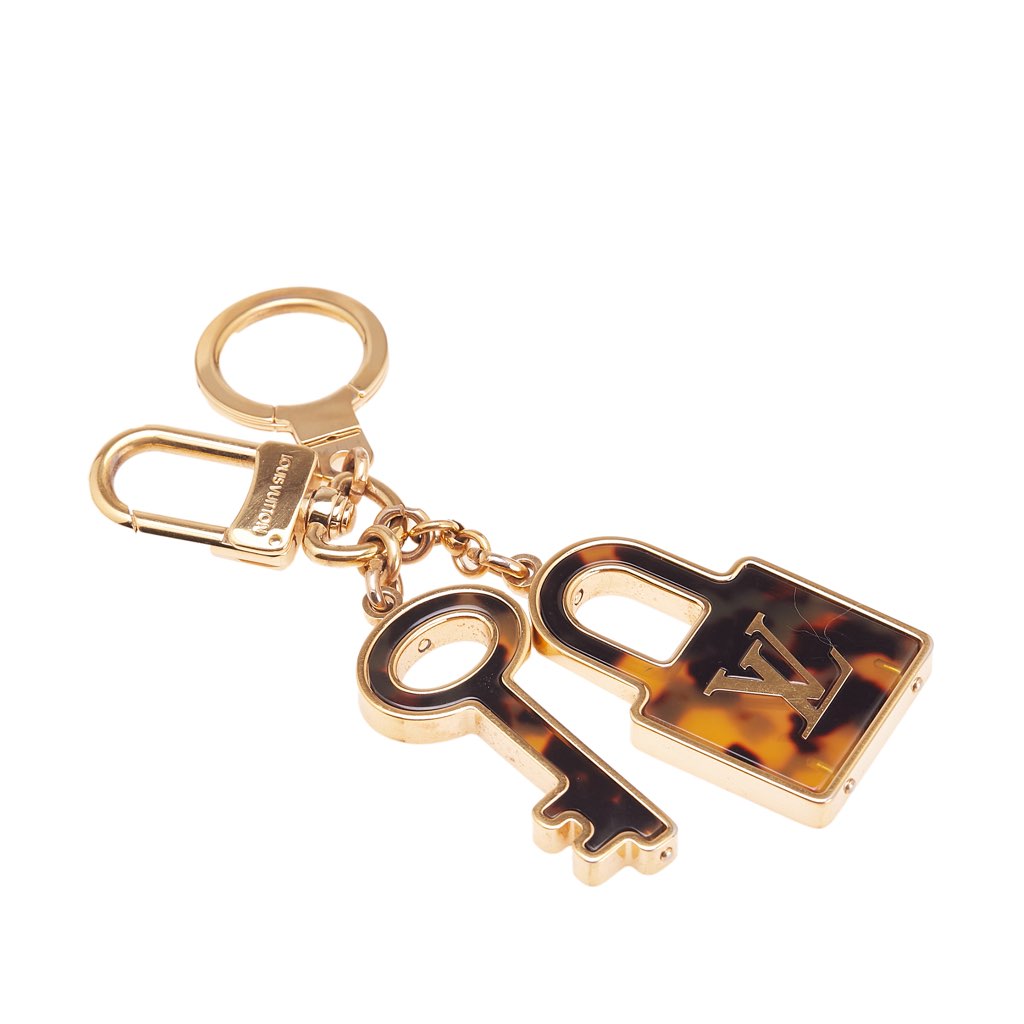 This key chain features a gold-plated body, LV logo lock and key charms with tortoise shell resin details, and a lobster clasp and key ring closure.