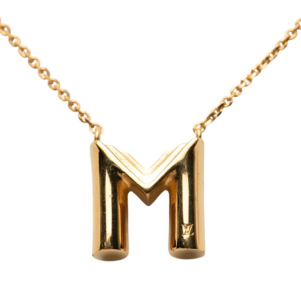 This necklace features a gold-tone metal body, a letter M pendant, and a lobster clasp closure.