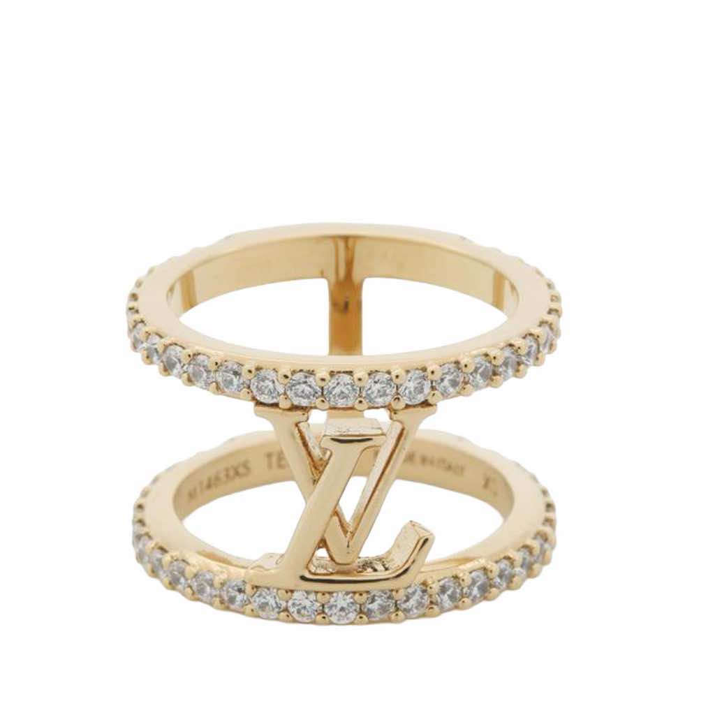 This ring features a gold plated metal body with crystals detail. US Size 4.5.