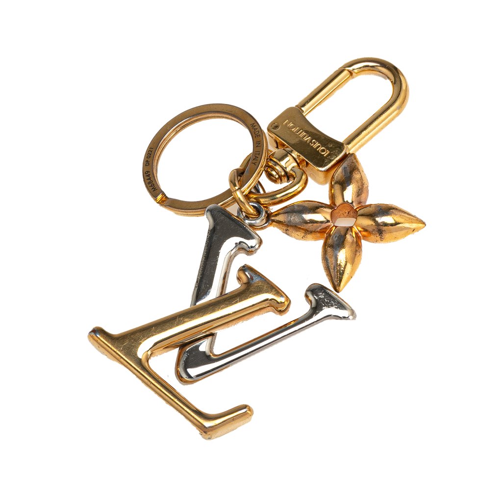 This bag charm features a gold plated body and silver tone, a metal key ring, and a lobster claw clasp.