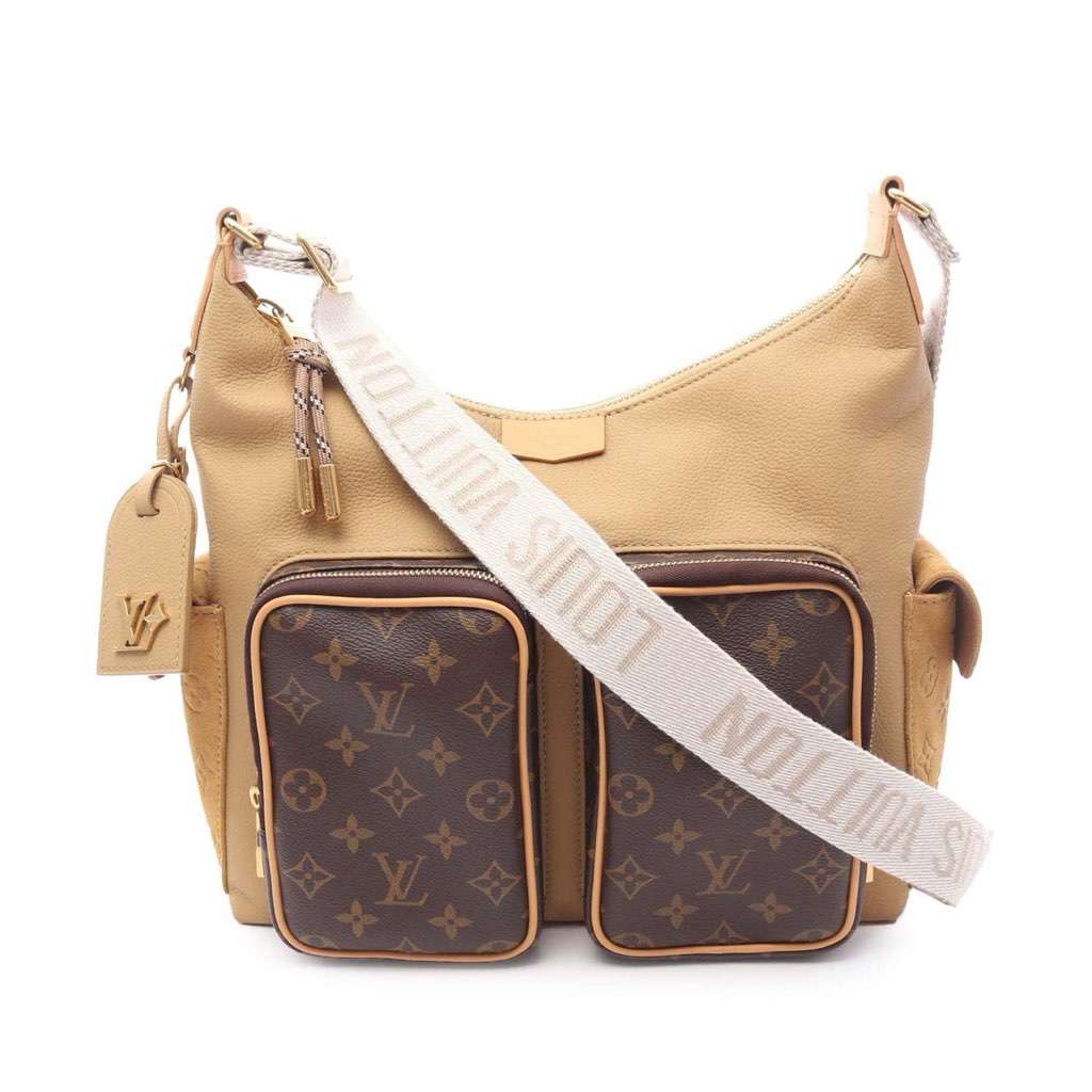 The Hobo Cargo features a leather body, an adjustable flat canvas strap, a top zip closure, exterior front monogram canvas zip pockets, and exterior side suede flap pockets.