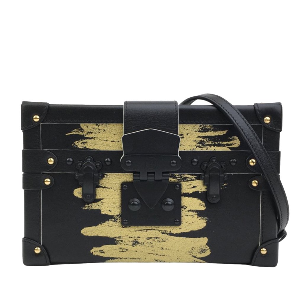The Petite Malle features a leather body, a detachable flat leather shoulder strap, a top strap with S-lock and magnetic closure, and an interior slip pocket.