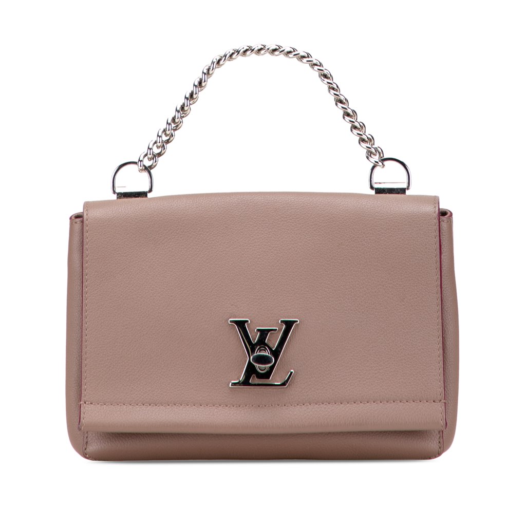 The Leather LockMe II BB features a leather body, a chain link handle, a front flap with twist lock closure, and an interior slip pocket.