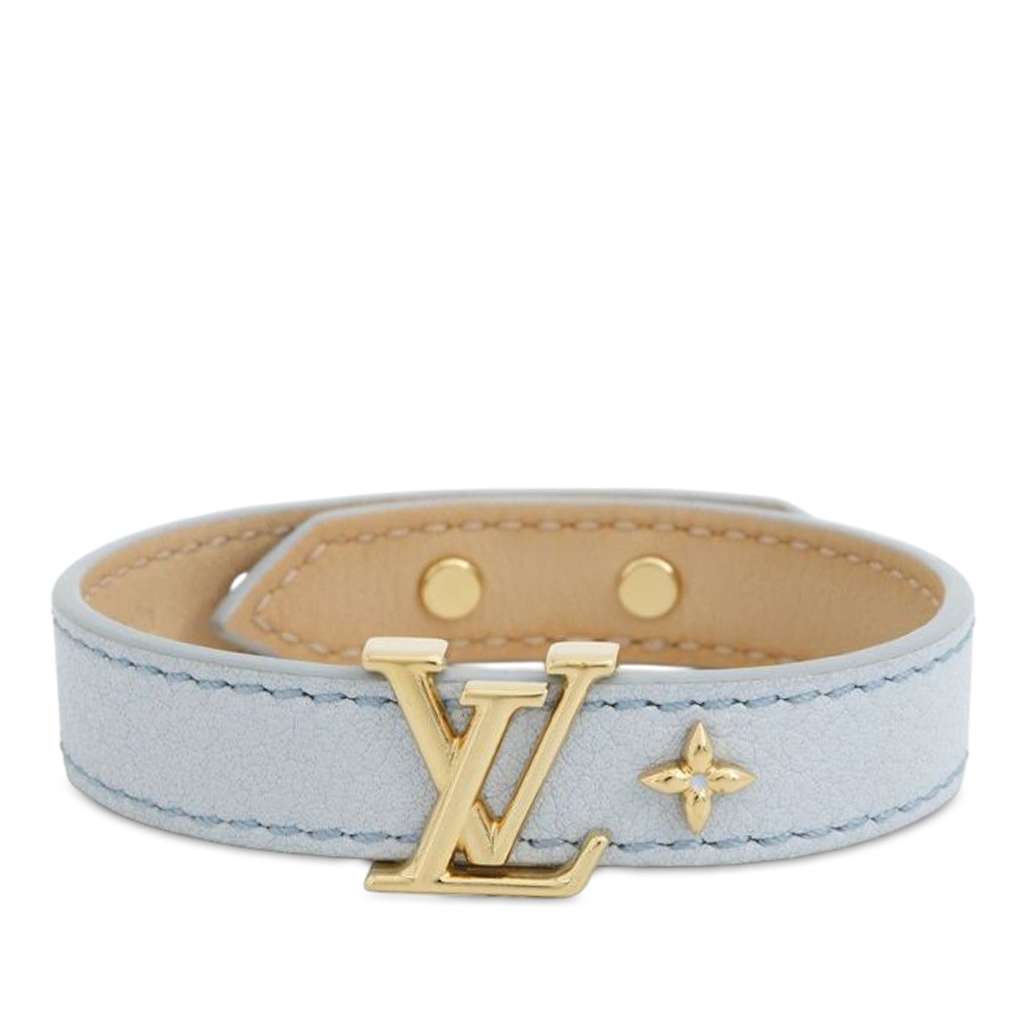 This bracelet features a leather and gold plated metal body.