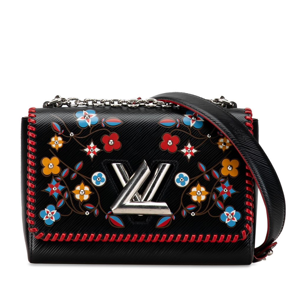 The Twist MM features an epi leather body with floral details, a chain link strap with leather guard, a flap with LV turn lock closure, and interior slip pockets.