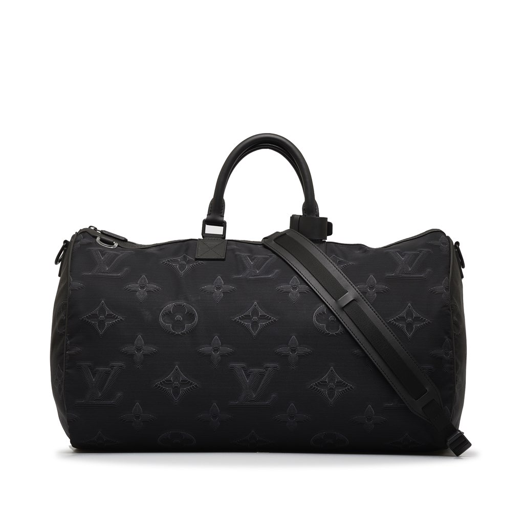 The 3D 2054 Keepall Bandouliere 50 features a reversible nylon body with leather trim, rolled leather handles, a detachable flat shoulder strap, a top zip closure, and a zip pocket.