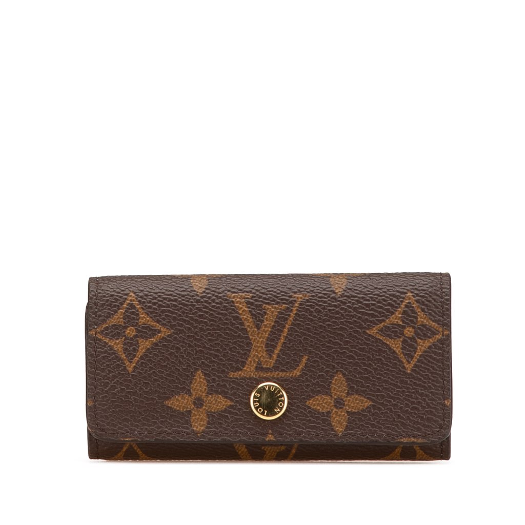This key holder features a monogram canvas body, a snap button closure, and 4 metal key holders.