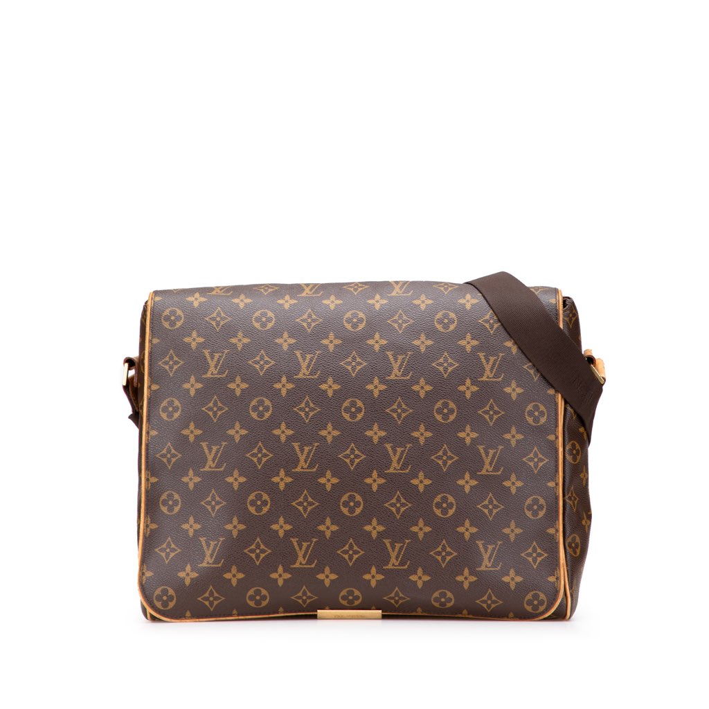 The Abbesses features a monogram canvas body with vachetta leather trim, an adjustable flat shoulder strap, a front flap with loop closure, and interior zip and slip pockets.