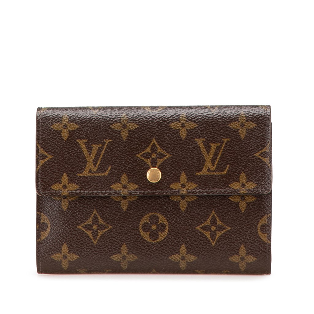 This wallet features a monogram canvas body, a flap with a snap button closure, and interior flap and slip pockets.