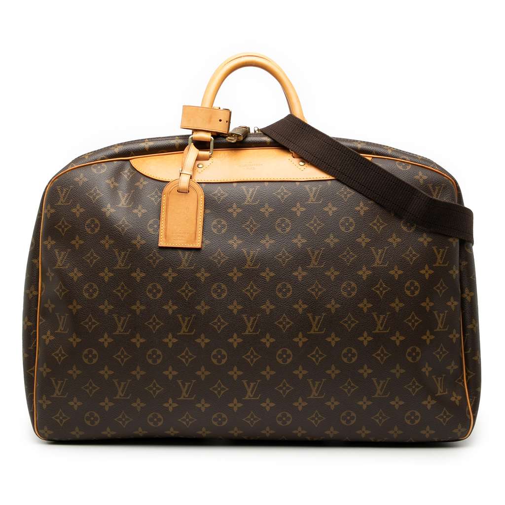 The Alize 24 Heures features a monogram canvas body with vachetta leather trim, rolled vachetta leather handles, detachable and adjustable strap, a zip around closure, and interior slip compartments.