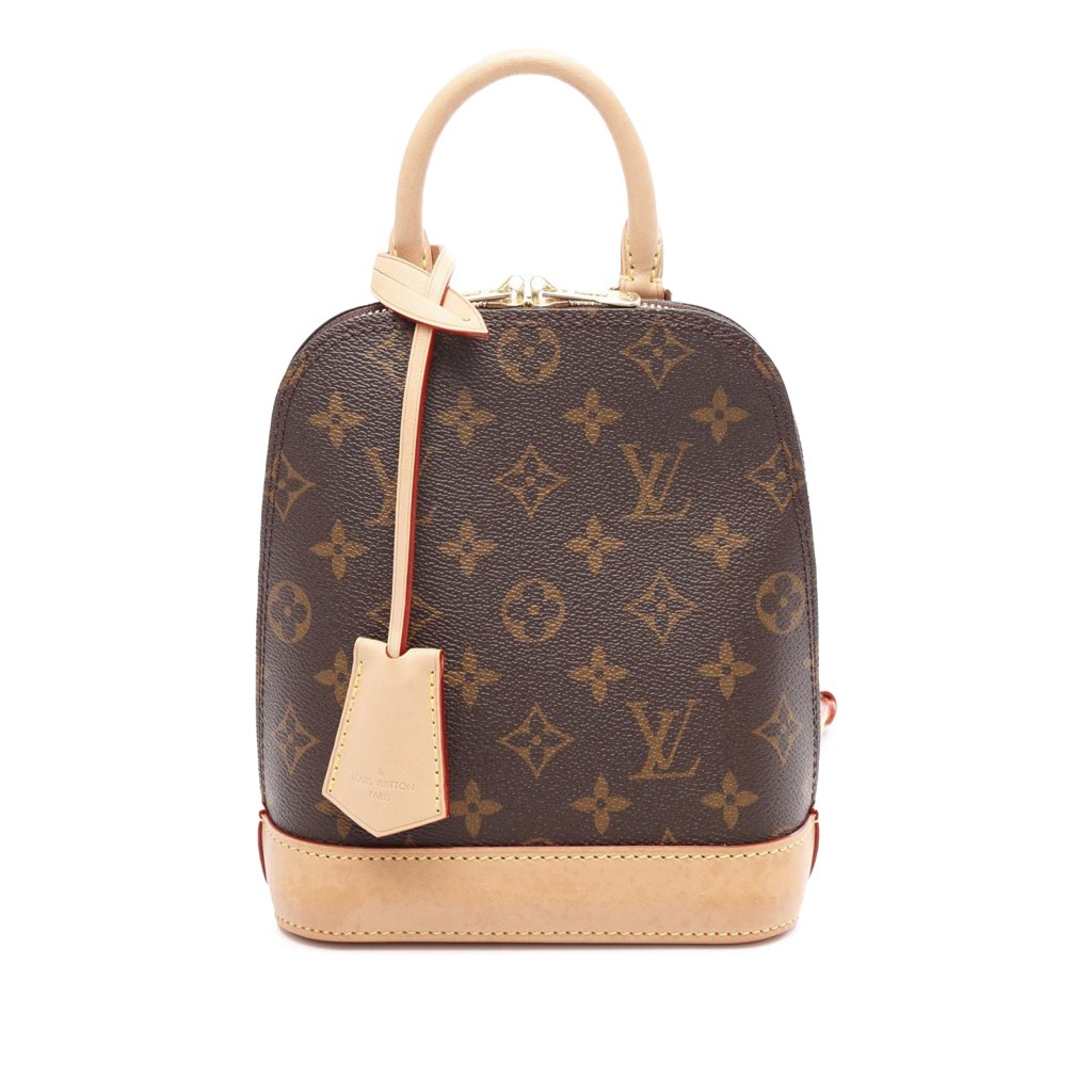 The Alma backpack features a monogram canvas body with vachetta leather trim, a rolled vachetta leather handle, adjustable and detachable vachetta leather back straps, a top zip-around closure, and an interior slip pocket.