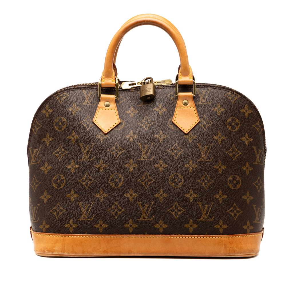 The Alma PM features a monogram canvas body with vachetta leather trim, rolled vachetta leather handles, a zip around closure, and an interior slip pocket.