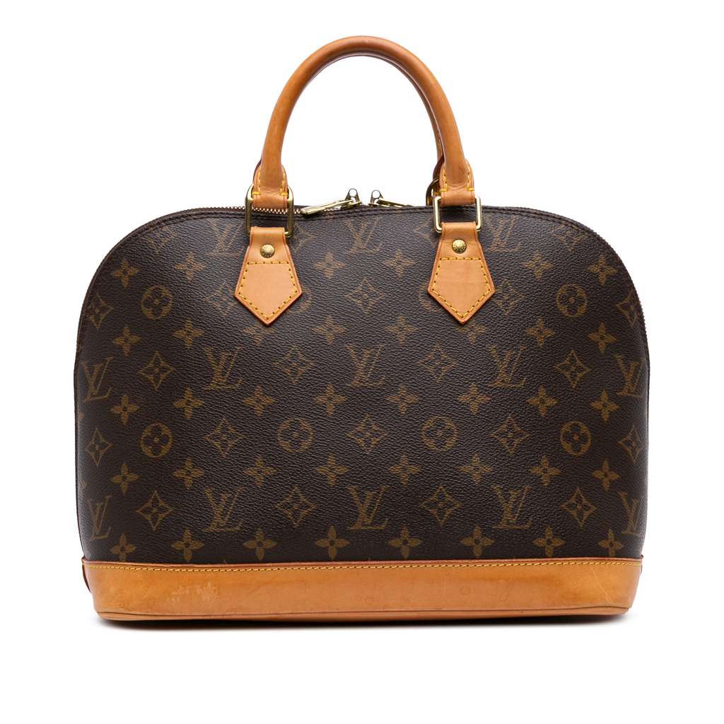 The Alma PM features a monogram canvas body with vachetta leather trim, rolled vachetta leather handles, a top zip closure, and an interior slip pocket.