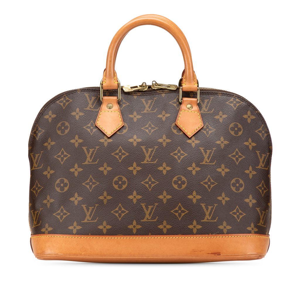 The Alma PM features a monogram canvas body with vachetta leather trim, rolled vachetta leather handles, a top zip closure, and an interior slip pocket.