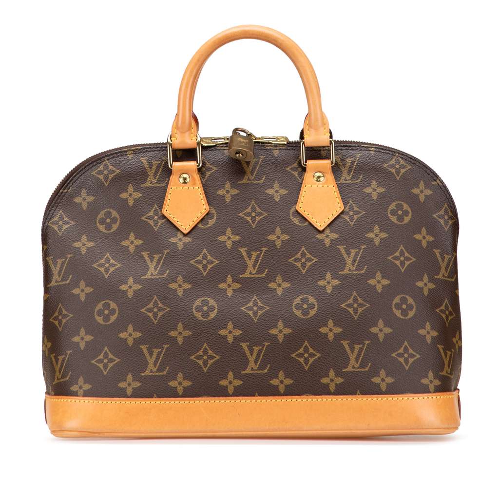 The Alma PM features a monogram canvas body with vachetta leather trim, rolled vachetta leather handles, a top zip closure, and an interior slip pocket.