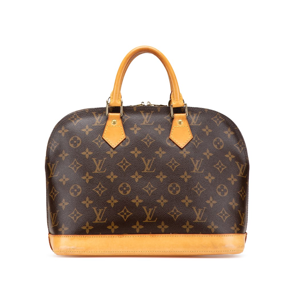 The Monogram Alma PM features a monogram canvas body with vachetta leather trim, rolled vachetta leather handles, a top zip closure, and an interior slip pocket.