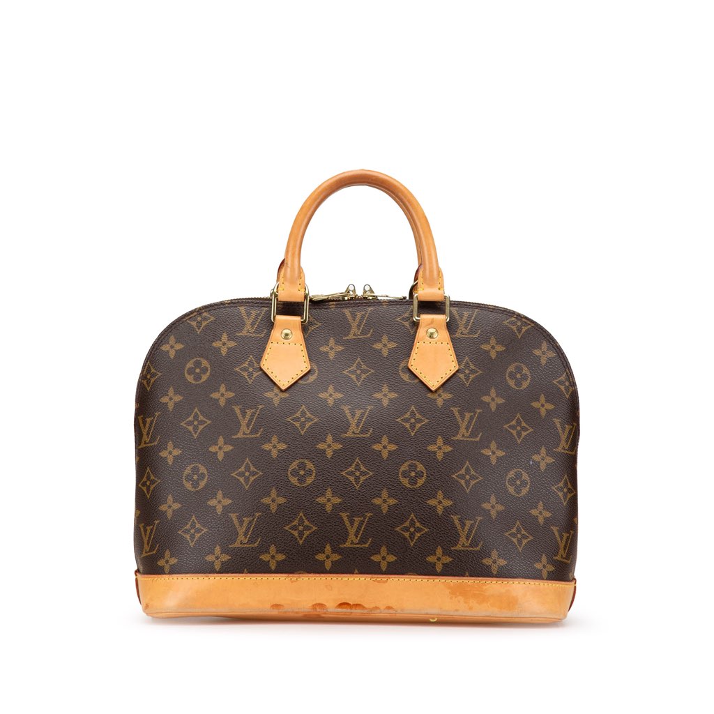 The Alma PM features a monogram canvas body with vachetta leather trim, rolled vachetta leather handles, a top zip closure, and an interior slip pocket.