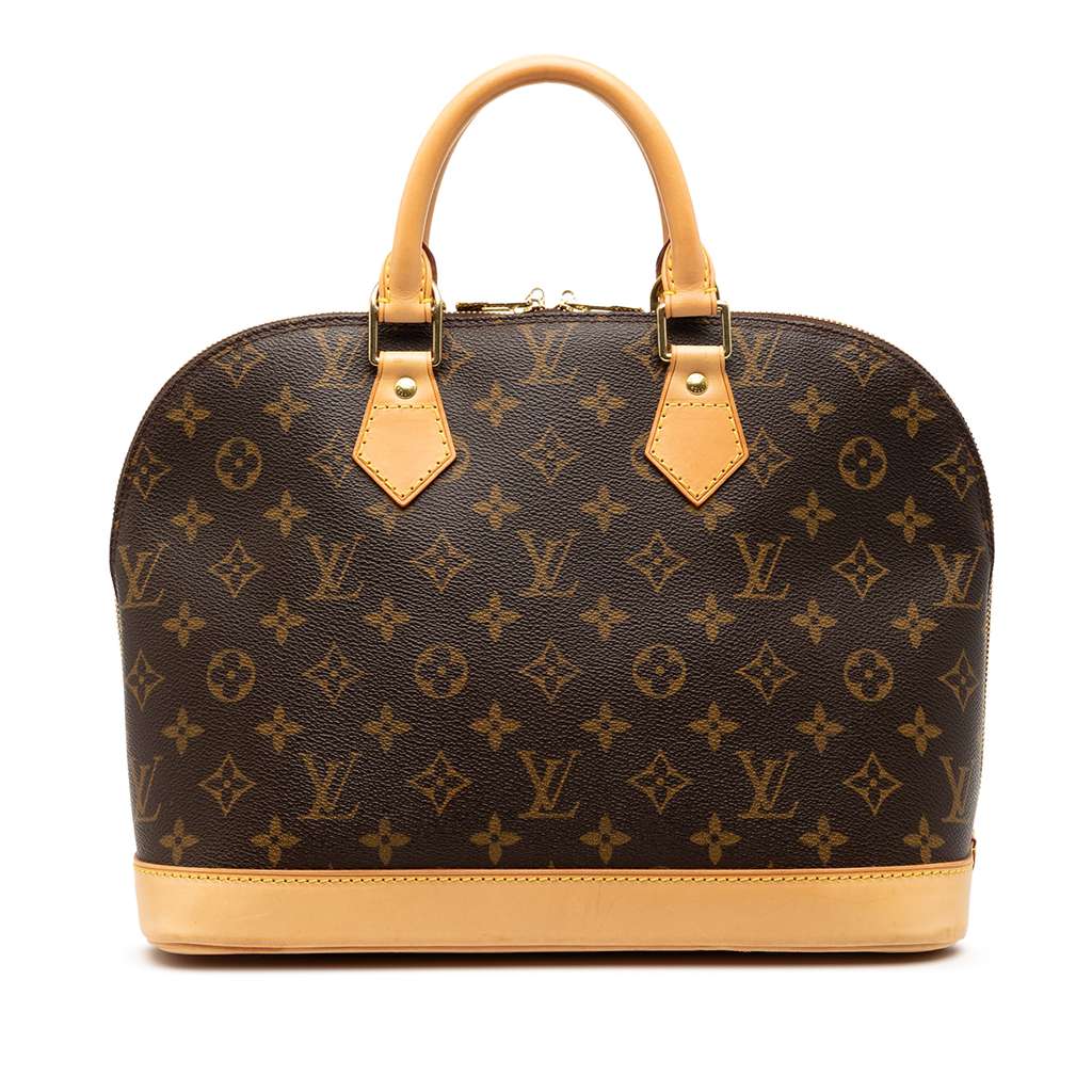 The Monogram Alma PM features a monogram canvas body, rolled vachetta leather handles, a vachetta leather bottom, a top zip closure, and an interior slip pocket.
