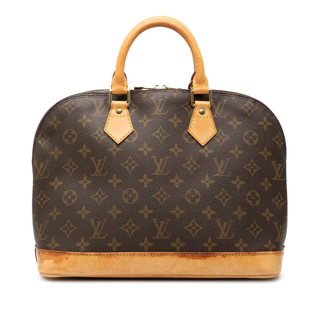 The Monogram Alma PM features a monogram canvas body with vachetta leather trim, rolled vachetta leather handles, a top zip closure, and an interior slip pocket.