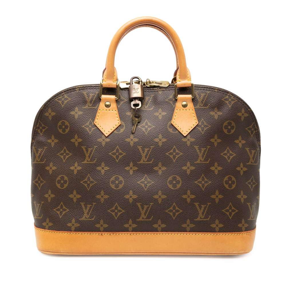 The Alma PM features a monogram canvas body with vachetta leather trim, rolled vachetta leather handles, a top zip closure, and an interior slip pocket.