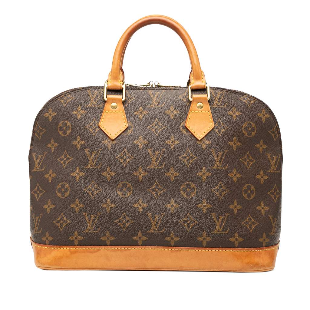 The Alma PM features a monogram canvas body with vachetta leather trim, rolled vachetta leather handles, a top zip closure, and an interior slip pocket.