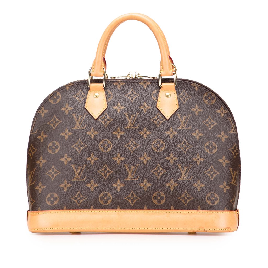 The Alma PM features a monogram canvas body with vachetta leather trim, rolled vachetta leather handles, a top zip closure, and an interior slip pocket.
