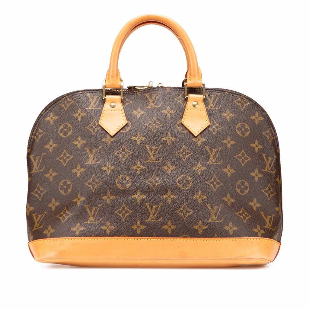 The Alma PM features a monogram canvas body with vachetta leather trim, rolled vachetta leather handles, a top zip closure, and an interior slip pocket.