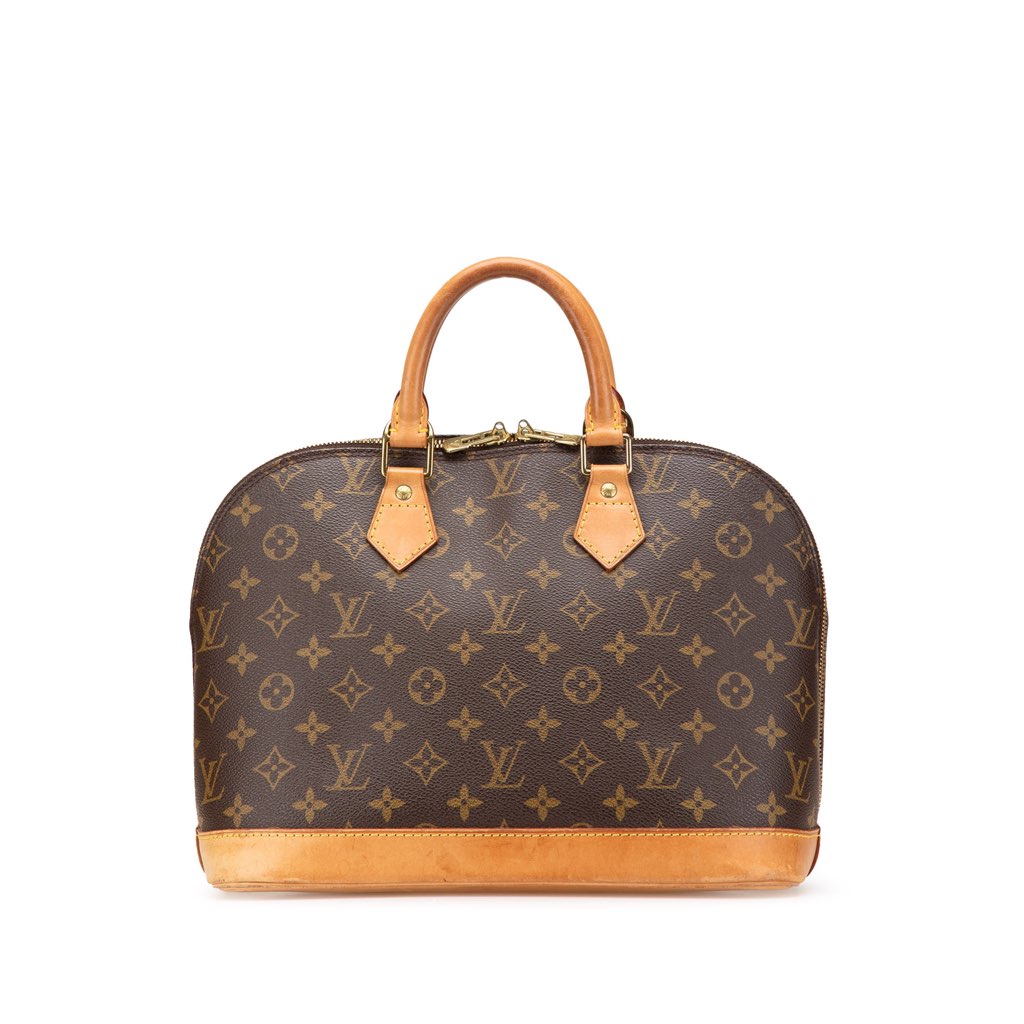 The Monogram Alma PM features a monogram canvas body with vachetta leather trim, rolled vachetta leather handles, a top zip closure, and an interior slip pocket.