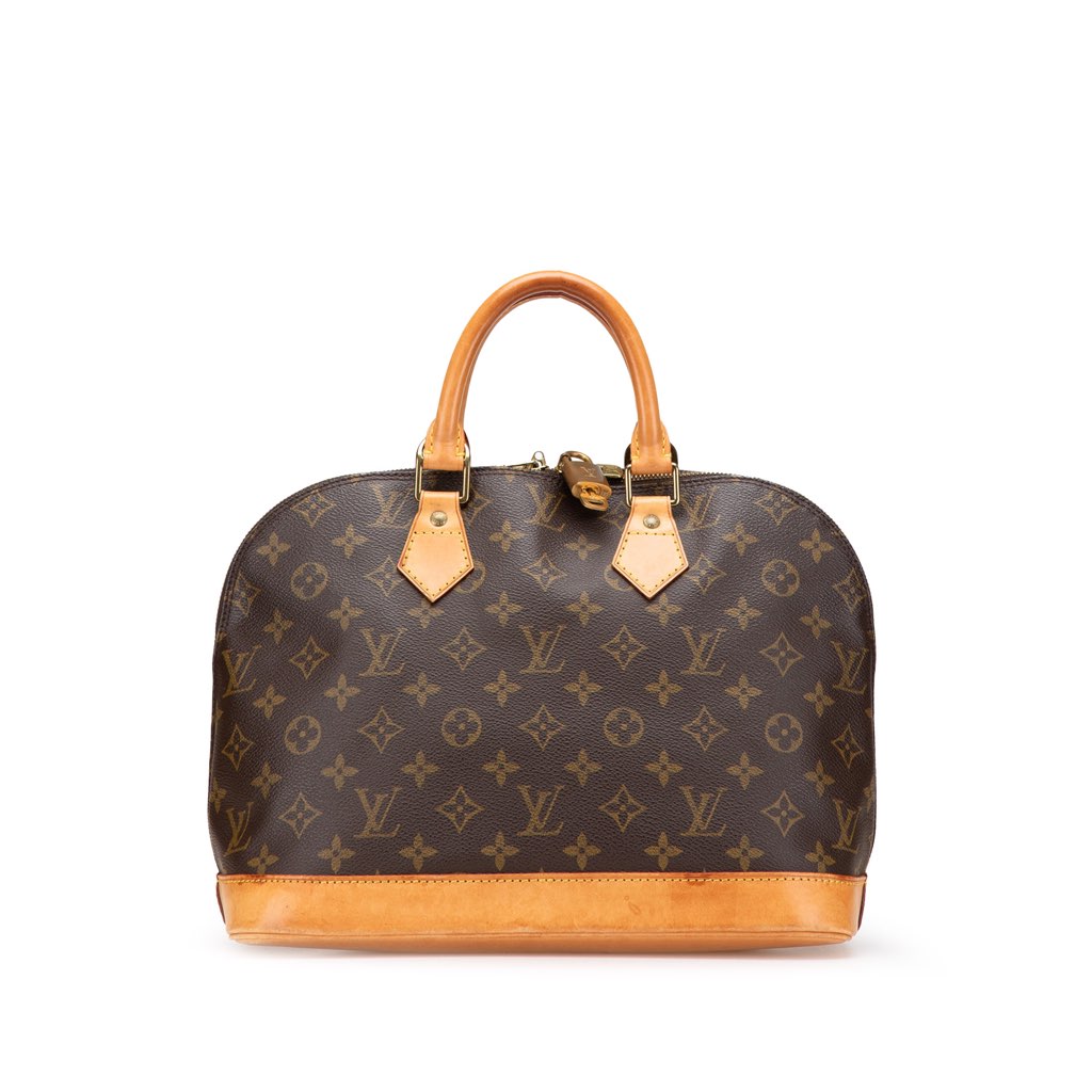 The Monogram Alma PM features a monogram canvas body with vachetta leather trim, rolled leather handles, a top zip closure, and an interior slip pocket.