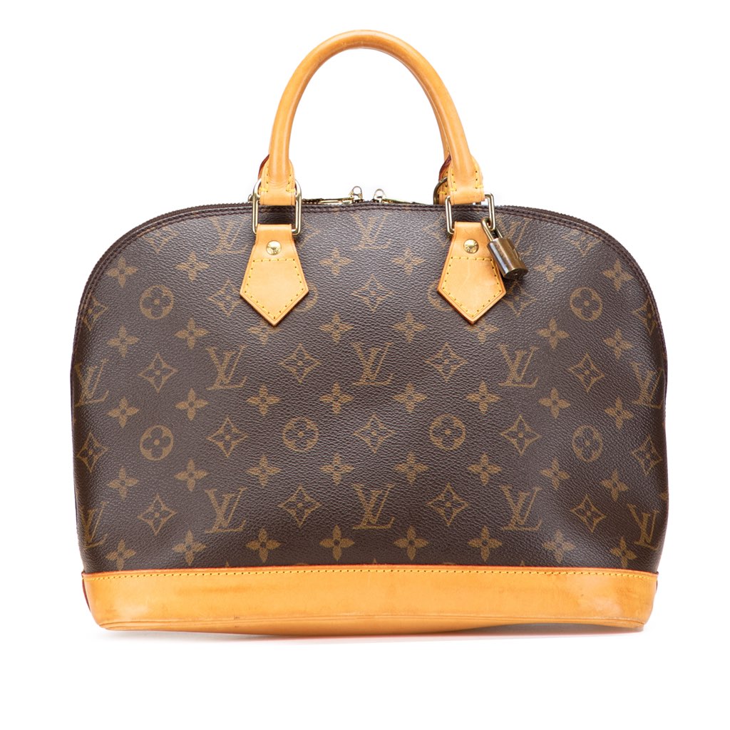 The Alma PM features a monogram canvas body with vachetta leather trim, rolled vachetta leather handles, a top zip closure, and an interior slip pocket.