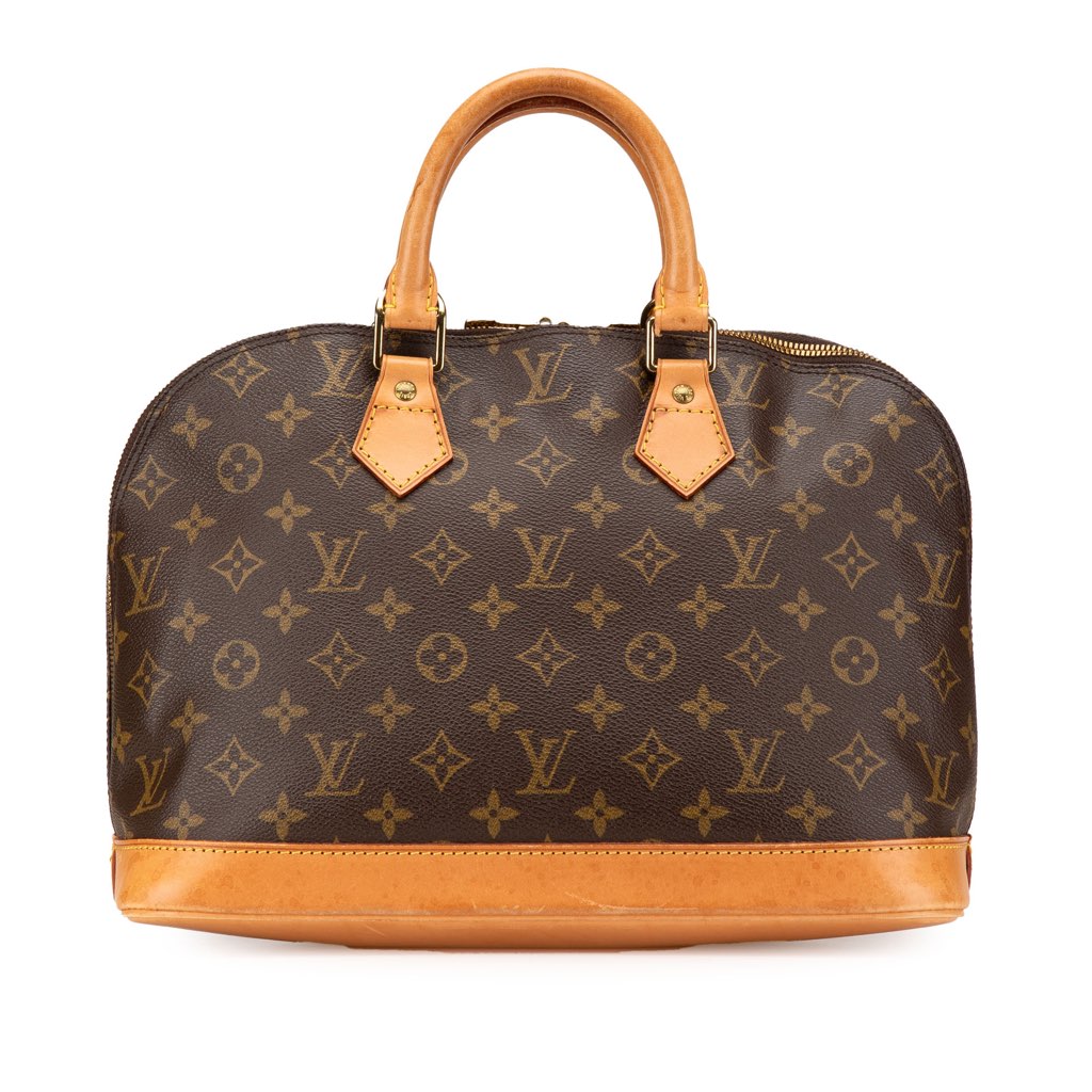 The Alma PM features a monogram canvas body with vachetta leather trim, rolled vachetta leather handles, a top zip closure, and an interior slip pocket.