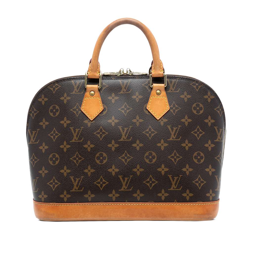 The Alma PM features a monogram canvas body with vachetta leather trim, rolled vachetta leather handles, a top zip closure, and an interior slip pocket.