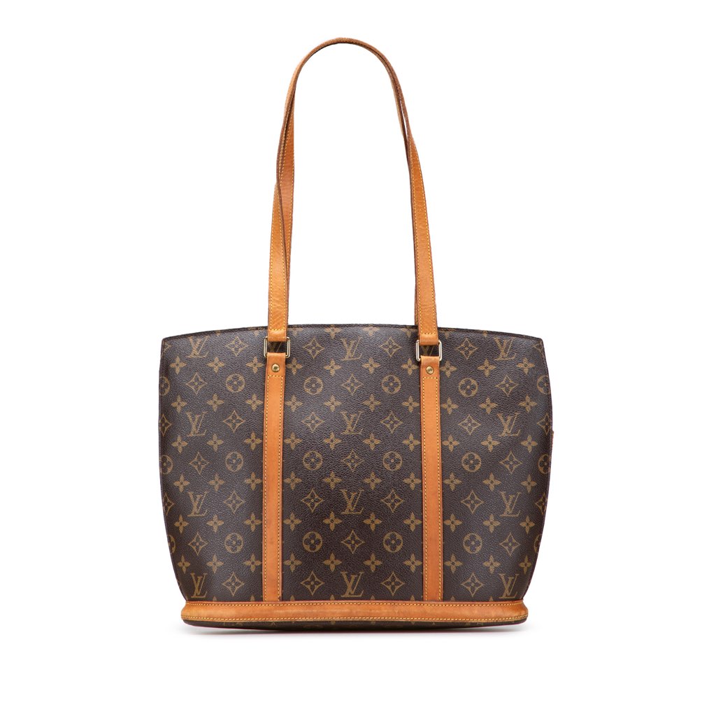 The Babylone features a monogram canvas body with vachetta leather trim, flat vachetta leather straps, a top zip closure, and interior zip and slip pockets.