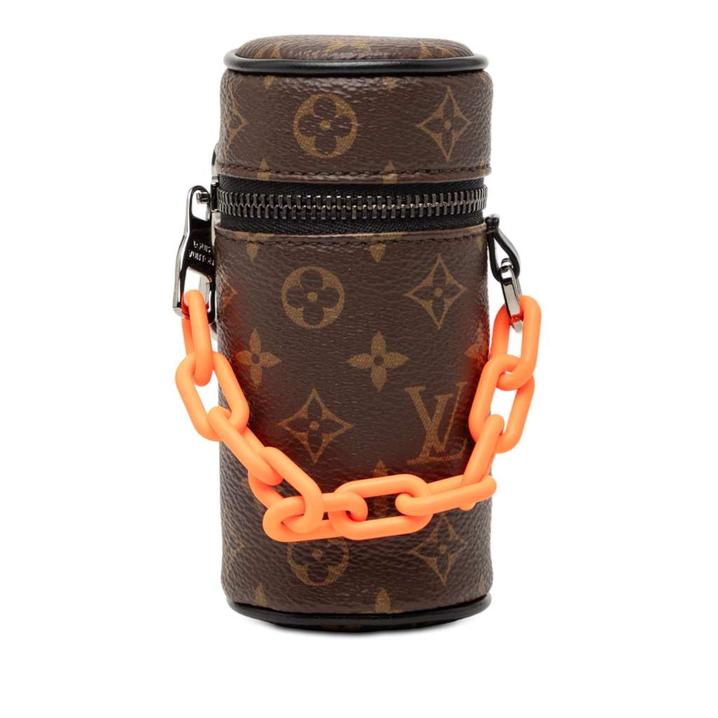 This pouch features a monogram canvas body, a top zip around closure, and a resin chain.