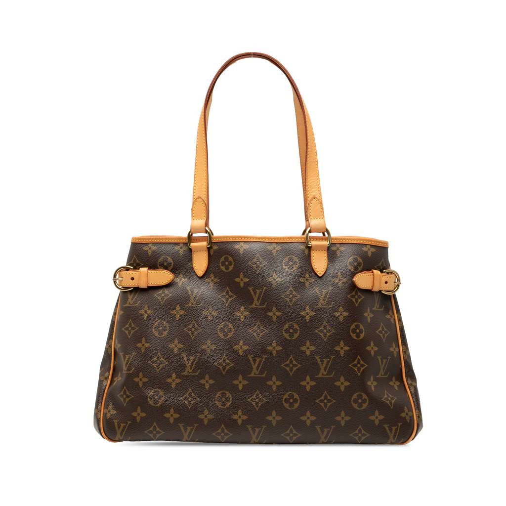 The Batignolles Horizontal features a monogram canvas body with vachetta leather trim, flat vachetta leather shoulder straps, an open top with a lobster clasp closure, and interior zip and slip pockets.