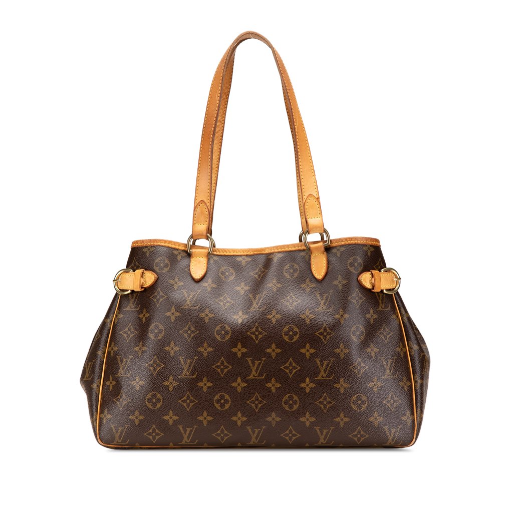 The Batignolles Horizontal features a monogram canvas body with vachetta leather trim, flat vachetta leather shoulder straps, an open top with a lobster claw clasp closure, and interior zip and slip pockets.