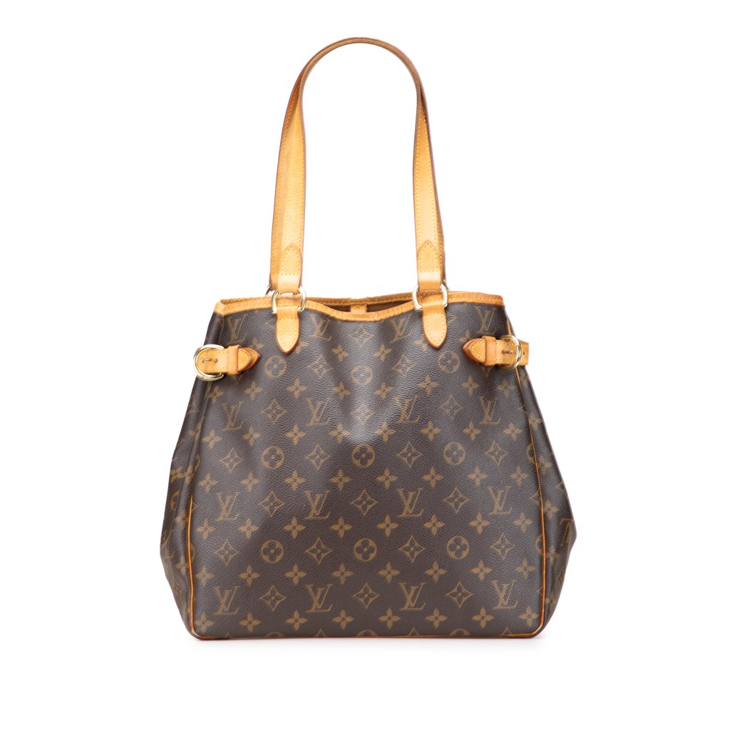 The Batignolles features a monogram canvas body with vachetta leather trim, flat vachetta leather straps, side belt details, an open top, and interior open and slip pockets.