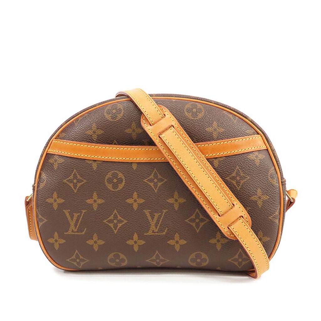 The Blois features a monogram canvas body with vachetta leather trim, an adjustable flat vachetta leather strap, a top zip closure, an exterior front slip pocket, and an interior slip pocket.