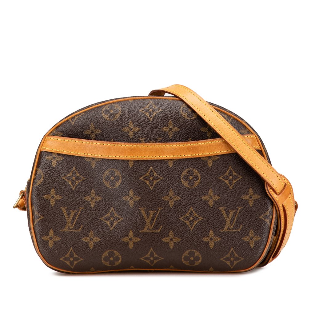 The Blois features a monogram canvas body with vachetta leather trim, an adjustable flat vachetta leather shoulder strap, a top zip closure, an exterior front slip pocket, and an interior slip pocket.
