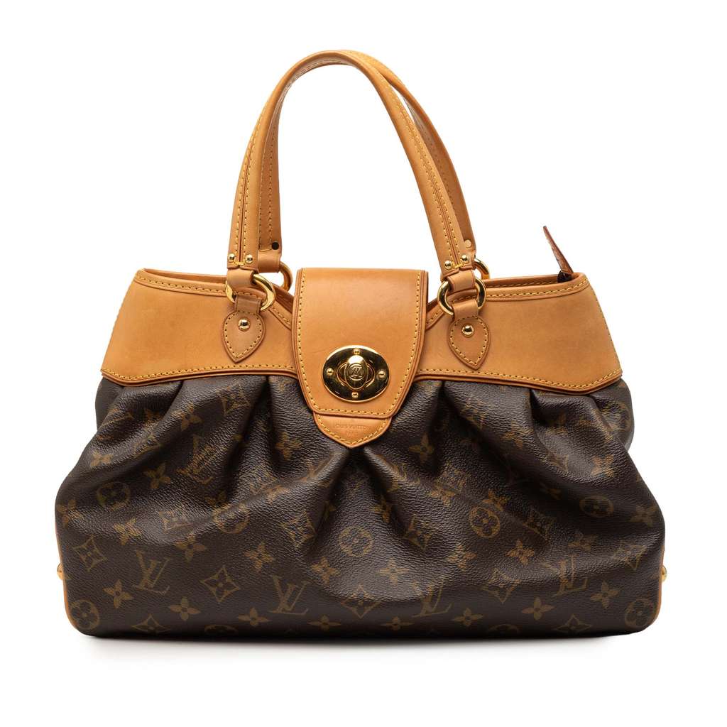 The Boetie PM features the Monogram canvas body, flat vachetta straps, a front strap with a twist lock closure, and interior slip pockets.