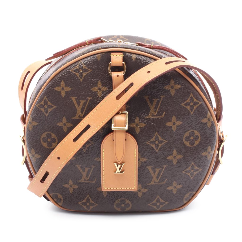 The Boite Chapeaux Souple features a monogram canvas body with vachetta leather trim, an adjustable flat vachetta leather strap, a top zip closure, an exterior slip pocket, and an interior slip pocket.