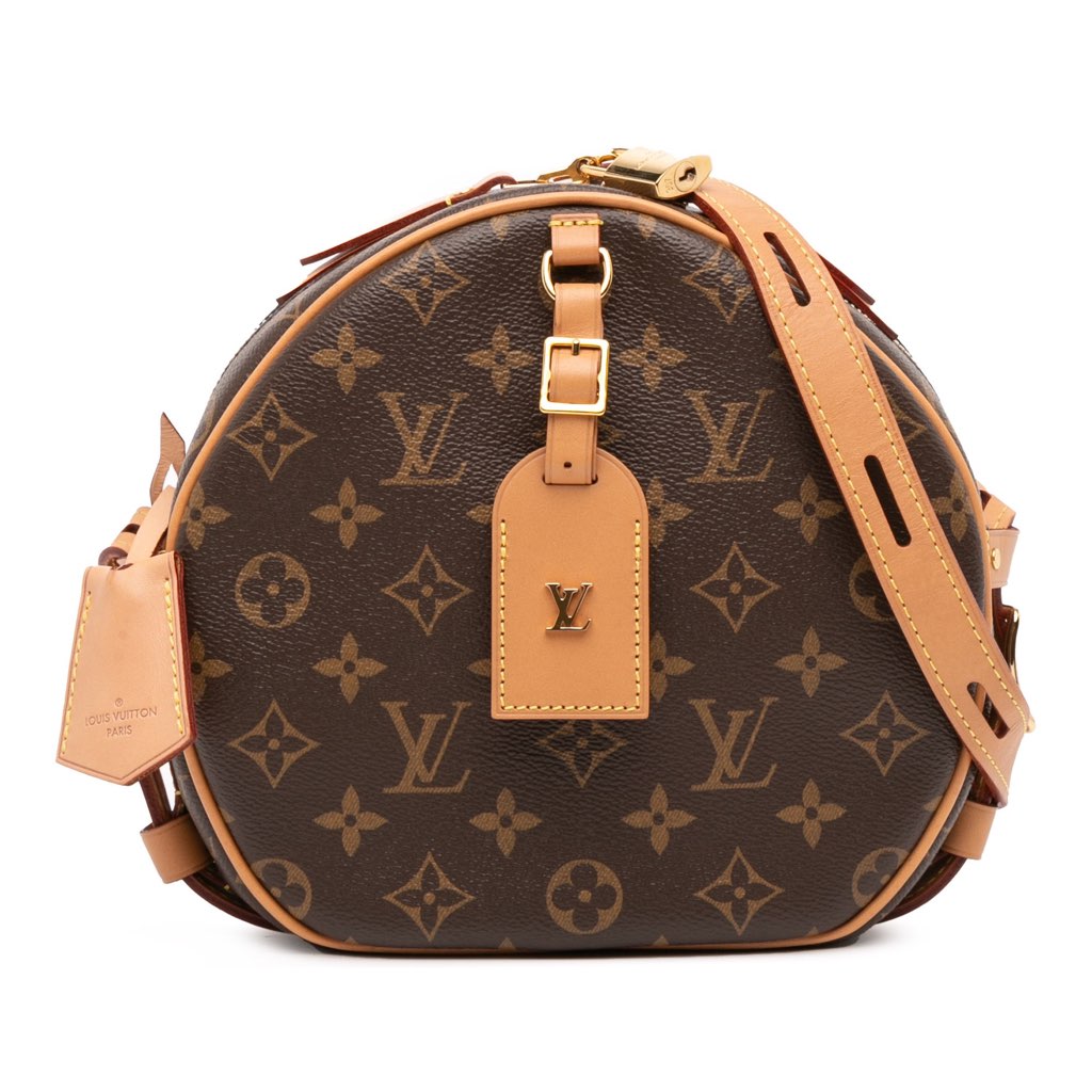 The Boite Chapeaux Souple features a monogram canvas body with vachetta leather trim, an adjustable flat vachetta leather strap, a top zip closure, an exterior slip pocket, and an interior slip pocket.