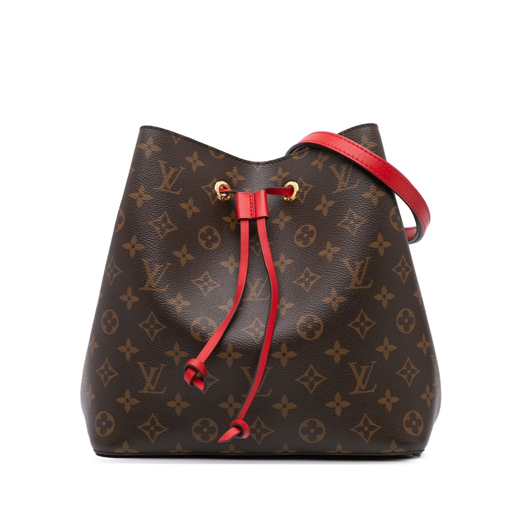 The Neonoe features a monogram canvas body, a detachable flat leather strap, a top drawstring closure, and an interior zip compartment.