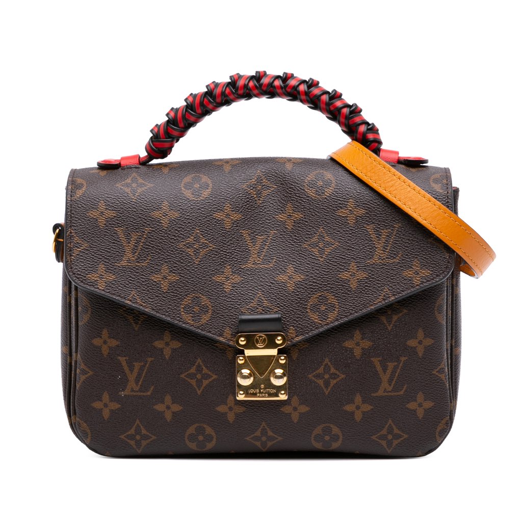 The Pochette Metis features a monogram canvas body, a braided leather top handle, a detachable flat shoulder strap, a front flap with an S-lock closure, an exterior back zip pocket, and interior slip pockets.