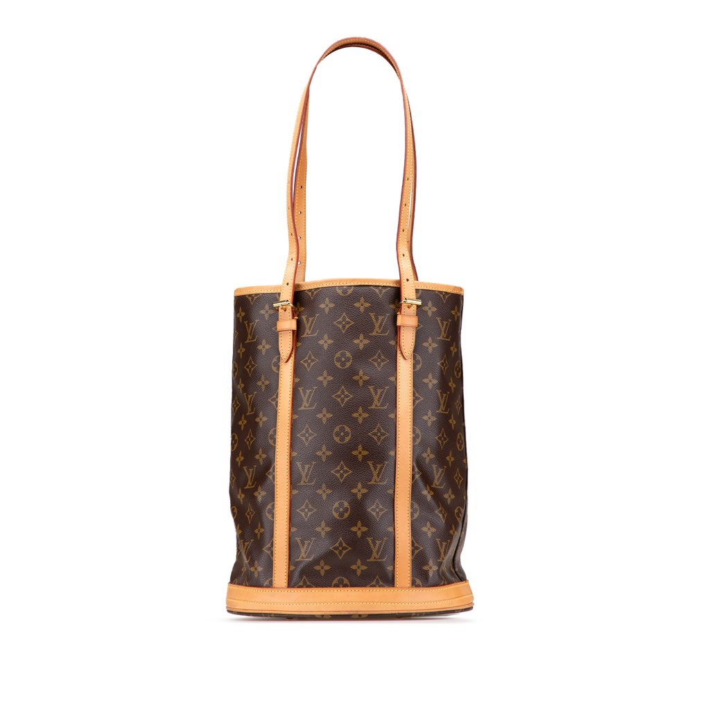 The Bucket GM features a monogram canvas body with vachetta leather trim, flat vachetta leather straps, an open top, and interior zip and slip pockets.