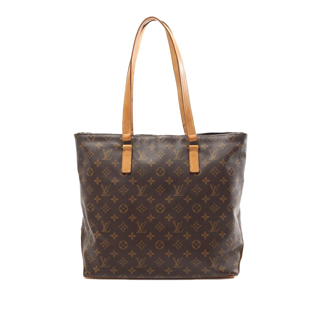 The Cabas Mezzo features a monogram canvas body with vachetta leather trim, flat vachetta leather straps, a top zip closure, and interior zip and slip pockets.
