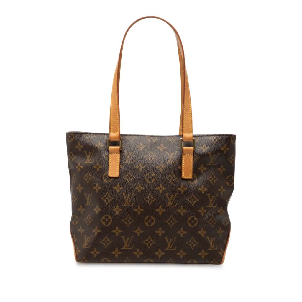 The Cabas Piano features a monogram canvas body with vachetta leather trim, flat vachetta leather handles, top zip closure, and an interior slip pocket.